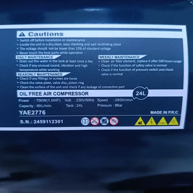 ضاغط هواء خالٍ من الزيت فائق الهدوء سعة24 لتر